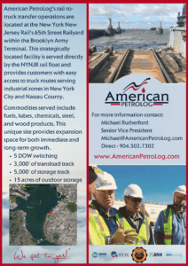July 28, 2020 Brooklyn, NY – American PetroLog’s Senior Vice President, Michael Rutherford announced “we have developed a great working relationship with the New York New Jersey Railway and the Port Authority of NY, which has allowed us to operate the only ‘for hire’ transload facility in the five boroughs of New York City. Our facility is located within the Brooklyn Army Terminal and this strategic location creates significant supply chain efficiencies for our customers”. American PetroLog has the capability to transload and store many different commodities, with their initial focus being on biofuels, steel, building materials and non-perishable food products.