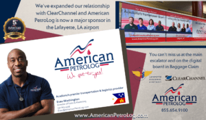 July 27, 2020 Lafayette, LA – American PetroLog has entered into a long term agreement with ClearChannel to become a premier sponsor at Lafayette Regional Airport. Jeff Colonna, President & CEO said “as the premier transportation and logistics provider in Lafayette, LA, we felt that it was right to support our hometown airport, which provides safe travel for our team and customers that visit our main Sales & Operations Center in the heart of Cajun County.”