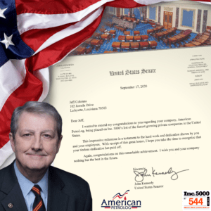 September 30, 2020 Washington, DC – Senator John Kennedy of Louisiana recognized the achievements of the American PetroLog team being named one of Inc. Magazine’s fastest growing private companies. In a letter to American PetroLog’s Jeff Colonna, Senator Kennedy stated “this impressive milestone is a testament to the hard work and dedication shown by you and your employees. With receipt of this great honor, I hope you take the time and recognize that your tireless dedication has paid off”.